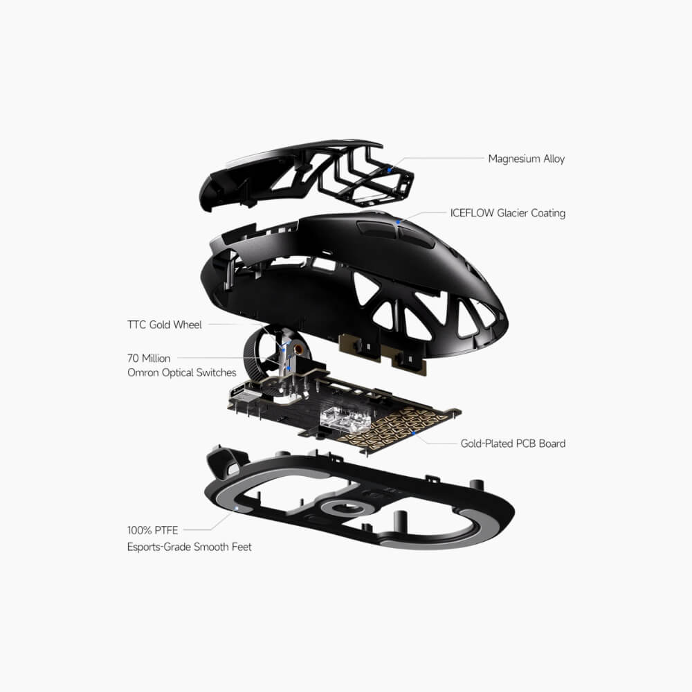 Experience fast, precise control with premium PTFE mouse feet that deliver smooth gliding performance across various surfaces. Additional glass feet and soft base film are included for enhanced glide customization right out of the box.