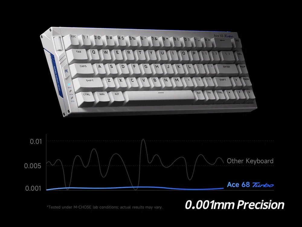 The Hall Effect technology in the Ace 68 Turbo allows adjustable actuation from 0.1 mm to 3.4 mm, letting gamers fine-tune movement keys for responsiveness and ability keys for accuracy.